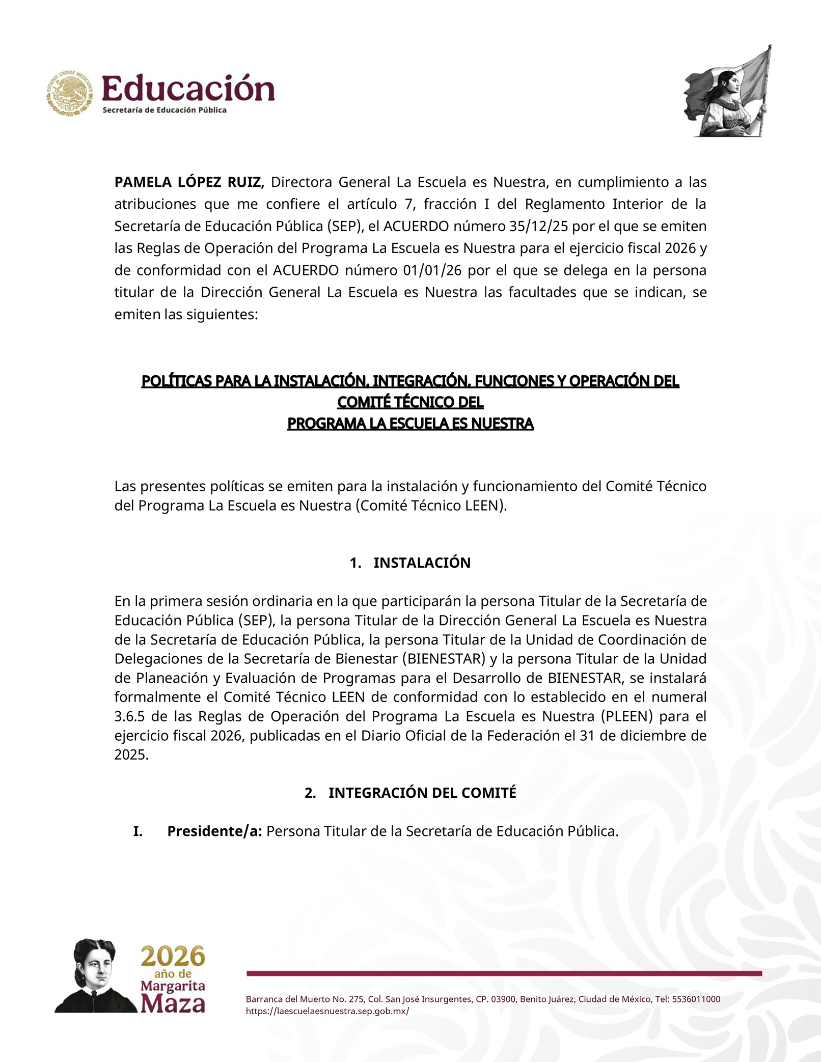 | 2026 | Políticas para la Instalación, Integración, Funciones y Operación del Comité Técnico del Programa La Escuela es Nuestra 2026. | |